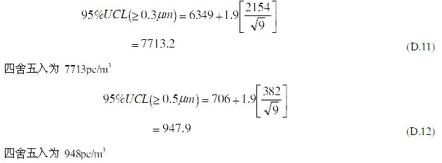 随着采样的进行记录下作为时间函数的粒子计数,并将各次观察到计数的时间与表达式中两列时间相比较。如果与表左侧的一列相比,证明给定的累积观察到计数的出现早于期望时间,该点的采样停止,空气被认为与规定等级限值不相符。如果与表右侧的一列相比,证明累积观察到计数的出现迟于期望时间,该点的采样停止,空气被认为与规定等级限值相符。如果累积观察到计数连续出现在两列时间之间,采样继续进行。如果与表左侧的一列相比较21次,计数仍继续进行,并且没有早于期望时间出现的计数,空气则符合全部单次采样的规定限值。