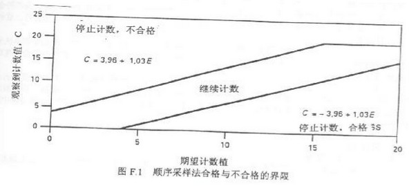 随着采样的进行,记录下作为时间函数的粒子计数,并将该计数与图F.1中的上、下限线进行比较。如果累积观察到计数与上限线相交,该点的采样停止,空气被认为与规定等级限值不相符。如果累积观察到计数与下限线相交,该点的采样停止,空气被认为与规定等级限值相符。如果累积观察到计数保持在上、下限线之间,采样继续进行。