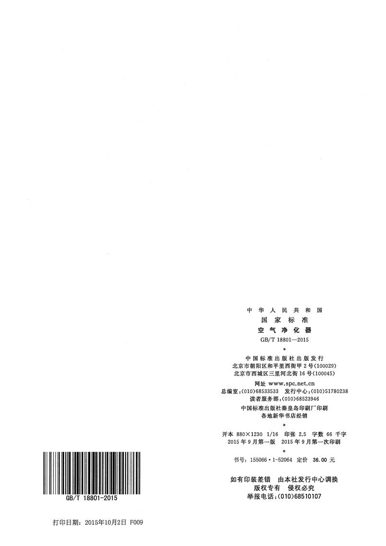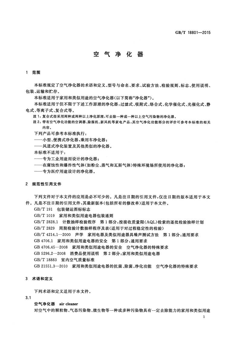 GB/T 18801-2015《空气净化器》国家标准全文: