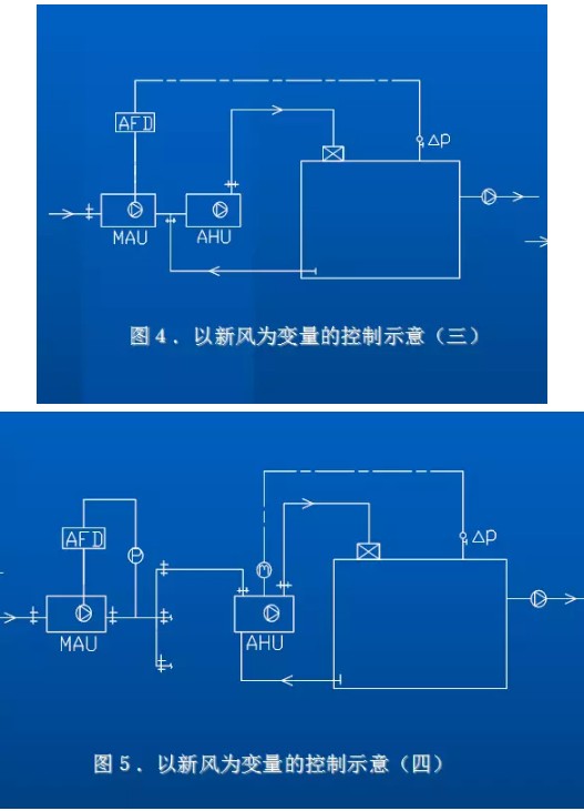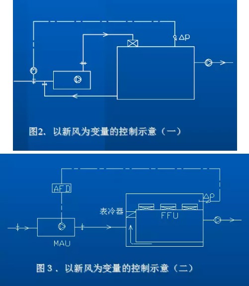 它适用于一个HVAC系统对一个洁净室的情况,控制较直接,当有采用新风机组时,一般宜采用变速风机以实现节能,尤其是新风量变化较大时.