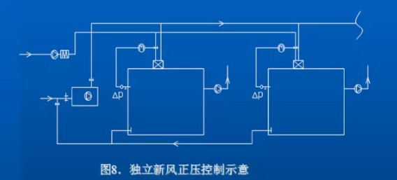 此种系统见图6.一般多适用于一个HVAC系统对多个洁净室的情况,由于风管布置及接管等情况,控制回风较控制新风更易合理实现.
