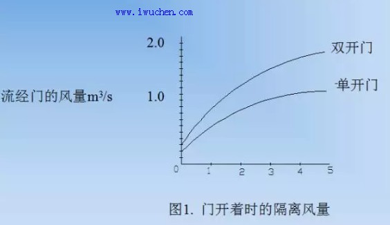 图1为国外有关研究的资料 ——门开着时,所需的隔离风量亦即所需流经门的风量,在此风量下才能保持低压差而无反向流出现。
