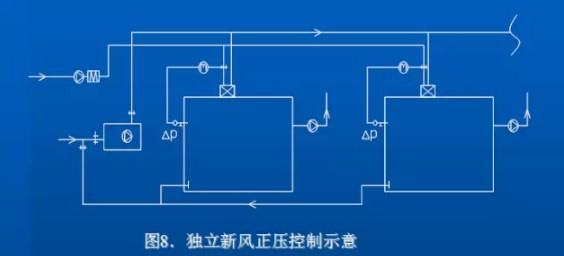 正压送风系统见图8,主要用于手术室的压差控制,正压新风采用二级过滤后通过调节阀送入各洁净室,调节阀由室内压差的维持,调节送入的正压风量。