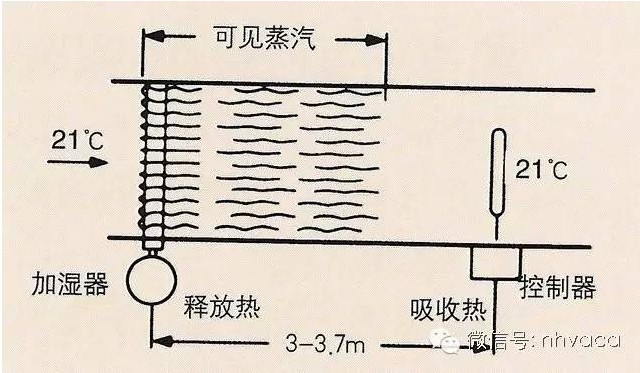 加湿过程及吸收距离:在空调机组或风道中,100度的蒸汽与较低温度的空气混合伴有热交换,蒸汽付出热时就会产生冷凝,产成可见水粒子,可见水粒子吸收了周围空气的热量,然后再气化,成为湿空气。此段过程即为干蒸汽加湿器的吸收气化的过程,可见蒸汽被完全气化的距离即为吸收距离。上图:“可见蒸汽”区域为过饱和状态,如果在此区域内有阻挡物,蒸汽在阻挡物上冷凝,会造成过滤器阻力超大,风机及风道中带水,严重甚至电机被烧毁。