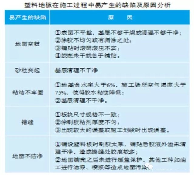 塑料地板与其他地面比较,其特点是:防火性能好,吸音效果好,耐冲击,略有弹性,对长时间站立操作的工作可减少疲劳,但造价较贵,制药企业可根据自身工艺要求适当选用。常用的塑料地板材料有乙烯基塑料板、聚氯乙烯软板、聚氯乙烯半硬质板和聚氨酯地坪涂料,弹性地面施工的主要工序包括基层处理→弹线→试铺→刷底子胶→铺贴塑料地面→铺贴塑料踢脚板→擦光上蜡。 塑料地板施工工艺比较简单,施工过程中易产生的缺陷和原因如下表: