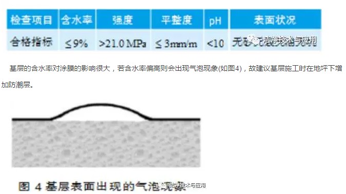 基层的含水率对涂膜的影响很大,若含水率偏高则会出现气泡现象(如图4),故建议基层施工时在地坪下增加防潮层。