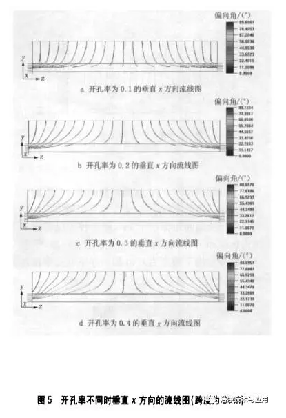 2、从每一种工况下的流线图都可以看出流程具有以下特点:流场两侧边缘处流线和中心地带流线近似垂直,而在1/4室宽处最先出现弯曲流线,从此向两侧流线垂直单向性越来越好。