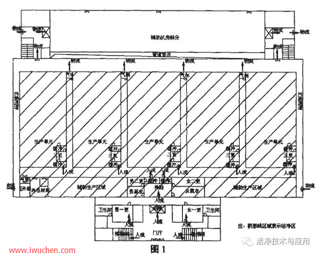 洁净车间内部的平面设计因工艺规模的差异而各不相同, 但以整体而言, 洁净车间大体上包括生产洁净区、生产辅助区、辅助机房及管道管线等几部分。这几个区域即要严格区分以避免相互交叉污染, 又要保持相互间的便利联系。在考虑它们之间的平面关系时, 要以洁净区域为核心。而其它区域本质上都是生产洁净区的服务和保障系统。因此, 将洁净区布置在中心, 其它区域围绕这个中心布置是较为合理的做法。在确定具体的相互位置关系时, 应考虑各个区域的相应条件, 根据不同的性质确定人员和物品出入口, 最终是整体平面布局与各区域的具体布局协调统一。