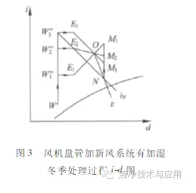 也就是冬夏季的新风比是相同的,为保证这一点,通常需要对新风加湿进行调节。风机盘管加新风系统有加湿冬季处理过程如图3所示。