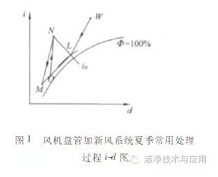 目前风机盘管加新风系统夏季常用处理过程i-d图如图1所示[2](不考虑风机引起的温升)。