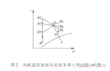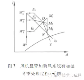 也就是冬夏季的新风比是相同的,为保证这一点,通常需要对新风加湿进行调节。风机盘管加新风系统有加湿冬季处理过程如图3所示。