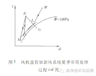 目前风机盘管加新风系统夏季常用处理过程i-d图如图1所示[2](不考虑风机引起的温升)。