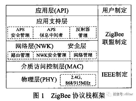 ZigBee是一种基于IEEE802.15.4无线标准的可靠、安全、网络拓扑能力强并且低成本的双向通信技术[3]。相比于其他常见的无线通信方式,ZigBee具有功耗低、组网能力强、协议简单、成本低等优点,单个协调器可以组建出一个可容纳超过65000个子节点的无线传感器网络。ZigBee协议栈工作效率很高,其协议层从底层到顶层可分为物理层(PHY)、介质访问控制层(MAC)、网络层(NWK)、安全层和应用层(API),协议栈框架如图l所示。