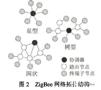 ZigBee无线网络按结构可划分为星形、树形、网状三种拓扑,如图2所示。星型结构的无线网络最简单,由一个协调器完成网络建立,可将具有目标网络标识符( PANID)的终端子节点加入到网络中并给其分配一个短地址,协调器通过该短地址可以区分不同的了节点;树形结构网络中包括一个协调器、若干路由节点和一系列终端子节点,路由节点除了可直接和协调器传递数据,还可以实现与其他路由节点及终端子节点进线数据通信,该种方式扩大了网络覆盖范围网状结构与树形结构有共同点,网络中的路由节点还可通过自组织实现多个通道的数据通信,在冗余的通信路径下可大大提高无线传感器网络通信的可靠性。对于规模较小的厂房,若环境监测主机至传感器节点距离未超过100 m,则组建星型结构的无线网络即可满足;若要对规模达到几万m2的大型厂房实现温湿度监控, 则组建网状结构的无线传感器网络最为妥当。
