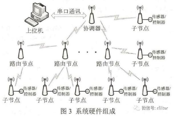 系统设计了基于CC2530的低功耗ZigBee无线网络,无线模块包含协调器模块、路由节点模块和终端子节点模块三种。ZigBee主芯片选用TI公司集成Flash的CC2530芯片,基于CC2530同时结合TI业界领先的Z-Stack协议栈可开发出一个低功耗的远程无线解决方案,上述三种模块各包含CC2530最小系统电路部分[4]。此外协调器模块含有串口通信电路,可实现与上位机数据通信功能:对于路由节点模块,因其仅实现ZigBee模块间的无线通信,因而仅含有基本电路即可;终端子节点模块负责数据的采集,因此模块上需要设计传感器及其附属电路。为加强无线传输距离,可在模块上加入CC2591射频前端功率放大芯片。系统的硬件组成如图3所示。