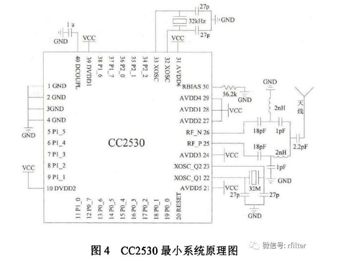 CC2530芯片内部集成度很高,只需在芯片外围连接少量电容、电阻、电感及晶振等元件即可工作。芯片内部已集成阻容振荡器,但容易受环境温度的影响从而造成时钟不精确。因此在外围电路设计振动频率为32 MHz和32 kHz的晶振,并使用27pF的电容帮助起振,分别用于射频(RF)和定时器的正常工作。考虑到后期更换、维修等情况,设计电路时可将所有引脚引至排针,可通过可插拔形式将其固定在母板上同时最小系统供电取自母板。CC2530最小系统是协调器、路由节点和子节点实现无线功能的最基本电路其原理如图4所示。