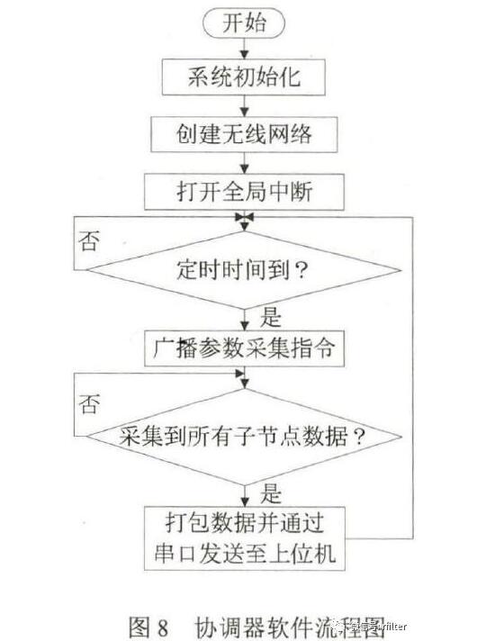 协调器负责组建网络和管理网络,上电后首先进行系统初始化,接着创建无线网络并将无线信号接收范围内具有目标网络标识符的路由节点和终端子节点加入到网络中,然后打开全局中断并进入数据采集环节;数据采集频率可以自定义,通过协调器的定时器控制广播参数采集指令,并等待接收来自各个子节点的数据,最后接收完毕后,协调器将数据打包并通过串口发送至上位机,采集过程将一直持续进行。协调器软件设计流程图如图8所示。
