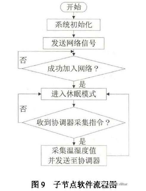 终端子节点模块上设有传感器,负责采集监测区内的温湿度值,同时能够通过无线形式与协调器进行数据交换。子节点上电后首先进行系统初始化,接着开始搜索无线信号范围内的网络同时发送申请入网的信息,待协调器确认子节点的目标网络标识符后便可组入网络。出于功耗考虑,若子节点未收到协调器广播的参数采集指令,则会一直处于低功耗休眠工作模式下。当有数据传输请求时,子节点可立即由休眠模式转入正常工作模式,继而可以进行环境温湿度值的采集,并将数据发送给协调器。子节点软件设计流程图如图9所示。