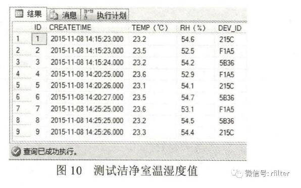 为验证系统设计方案的可行性,选取国内某一洁净厂房作为实验对象。将三个无线温湿度采集节点布置于洁净室不同位置,同时协调器置于洁净室中间位置,实验时洁净室内的空调系统和生产线均正常运行系统上电后建立无线网络,设定采集频率为每5 min采集一组温湿度数据,完成一系列初始化后开始工作上位机通过串口通信方式获取协调器发送的包含子节点短地址(Dev ID)信息及子节点采集到的温湿度数值的数据包,并加以解析后将温湿度值、短地址存入SQL Server 2008数据库中,同时记录下采集数据的时间,数据库存储结果如图10所示。由数据看出,洁净室内不同位置的温度和相对湿度值稍有差异,但总体满足洁净室生产工艺的要求。