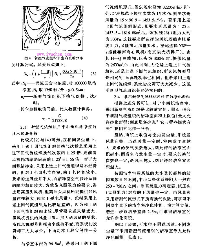 根据上述分析可知, 对于小面积洁净室, 采用新型气流组织是比较适宜的。_那么,适合于新型气流组织的洁净室面积上限值(最大允许净化面积) 到底是多少呢? 它与那些因素有关? 我们对此作一分析。
