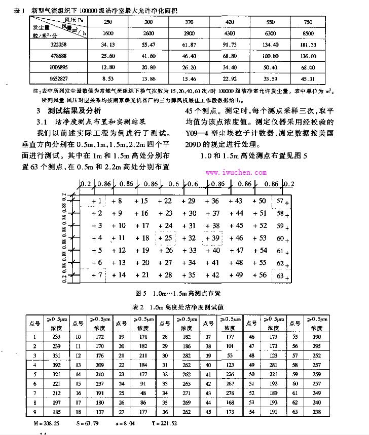 CW取1.0m标高的63个点平均值, 由测定结果知CW =208粒/升?≥0.5μm, 回风口区浓度 取前面2 .2m标高处回风口区浓度1点,5点,42点,45点四点平均值, 代入数据知: CR=270粒/升? ≥0.5μm。