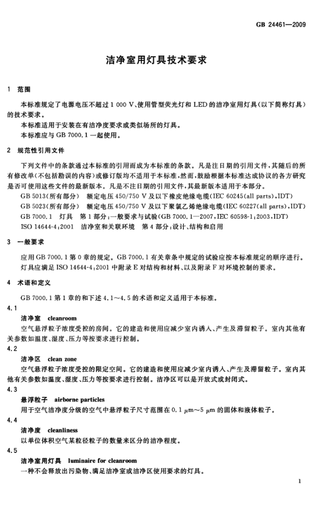 GB24461-2009 洁净室用灯具技术要求