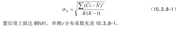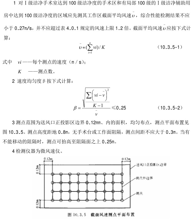 1Ⅰ级洁净手术室和洁净辅助用房检测前,系统应已运行15min,其他洁净房间应已运行40min。在确认风速、换气次数和静压差的检测无明显问题之后,再检测含尘浓度。对≥0.5μm和≥5μm的微粒,检测结果均应同时满足下列条件:各测点平均含尘浓度i中的最大值max不大于表3.0.3-1和表3.0.3-2中规定的级别上限浓度的80%;由各点平均含尘浓度i求出室平均浓度,算出统计值N,N=+t×σ,不大于表3.0.3-1和表3.0.3-2中规定的级别上限浓度的80%,则判定测定结果达到该洁净度级别。如果虽未超过级别上限但已大于该上限的80%,则应加大风量重测。