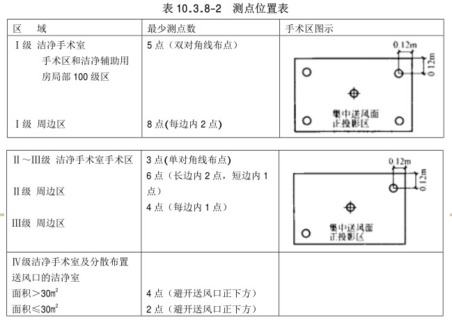 2 当送风口集中布置时,应对手术区和周边区分别检测,测点数和位置应符合表10.3.8?2的规定;当附近有显著障碍物时,可适当避开。