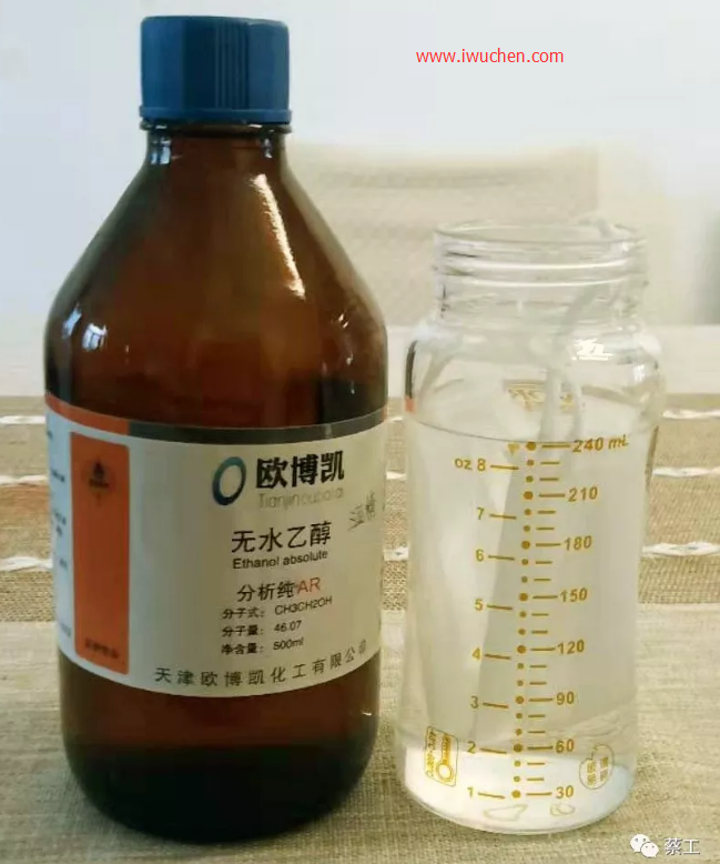 e) 医用酒精。药房断货,蔡工让梓琪爸爸去厂里拿了瓶无水乙醇,自己勾兑的(75%乙醇,25%清水),找出个奶瓶当量杯。