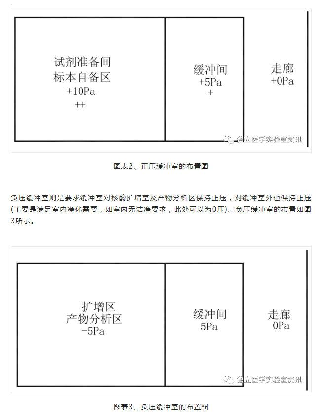负压缓冲室则是要求缓冲室对核酸扩增室及产物分析区保持正压,对缓冲室外也保持正压(主要是满足室内净化需要,如室内无洁净要求,此处可以为0压)。负压缓冲室的布置如图3所示。