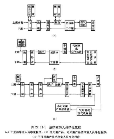 一般工业洁净室与生物洁净室人身净化流程如图27.11-1(a)、(b)、(c)所示。建筑设计师必须充分满足此要求。图中虚线框内的设施可根据需要设置。