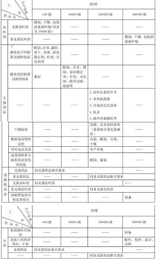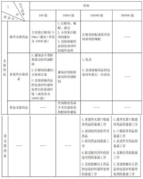 表A药品生产环境的空气洁净度等级举例