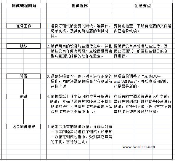 1. 准备好测试所需要的图纸,噪音仪,记录表格,及其他所需要的测试材料。4. 依据图纸上业主认可的位置开始进行测试,并确认没有其它噪音会干扰到测试的进行。