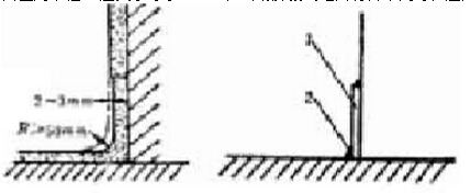 第2.3.8条 踢脚板部分施工时,应与墙面平齐或略缩进2~3mm。当踢脚板与地面材料相同时,可做成小圆角,其圆角半径R应大于等于50mm;当踢脚板与地面材料不同时,应用弹性材料嵌固,见图2.3.8。