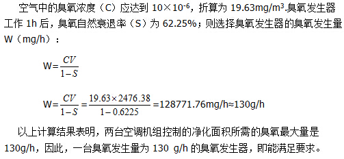 以上计算结果表明,两台空调机组控制的净化面积所需的臭氧最大量是130g/h,因此,一台臭氧发生量为130 g/h的臭氧发生器,即能满足要求。