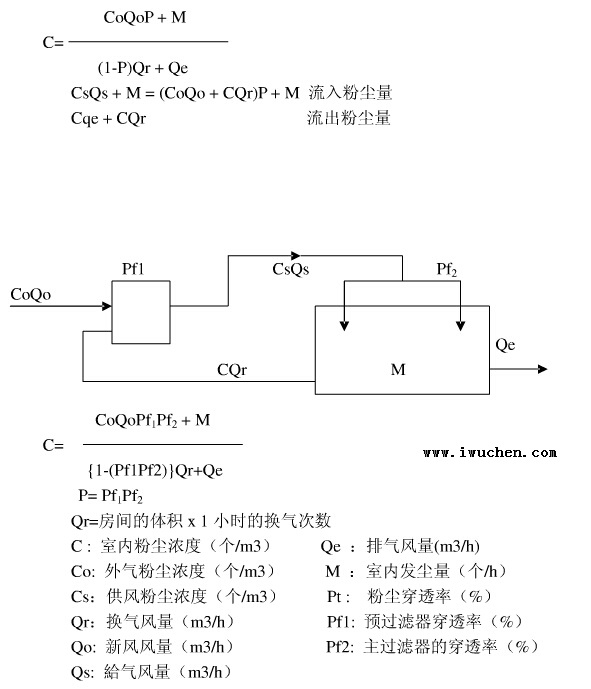 在净化间的设计上,要计算出为确保所要求的洁净度的风量和温湿度调整所需的风量。这里,只是把确保室内洁净度的计算方法列举出来。将室内的发尘量、新风的含尘两量作出假定,根据使用的空气过滤器效率,用下列公式通过换气风量等求出洁净度。