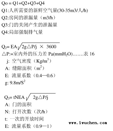 ● Qo外气风量,要考虑环境卫生环境上规定的、针对给气量及有害物质的局部排气。为使室内形成正压,其所需的风量,由下列公式求出。
